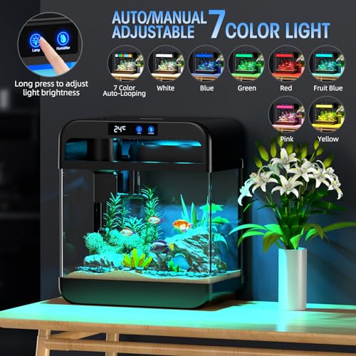 【Defining a Smart and Versatile Aquarium】 Acquire this smart fish tank to relish in four distinctive pleasures: automatically(looping mode) and manually adjustable 7-color lighting system, an aromatherapy humidifier with 3 spray modes for room, a real-time temperature sensor for continuous monitoring, and a revolutionary combination—a beautiful and colorful smart aquarium